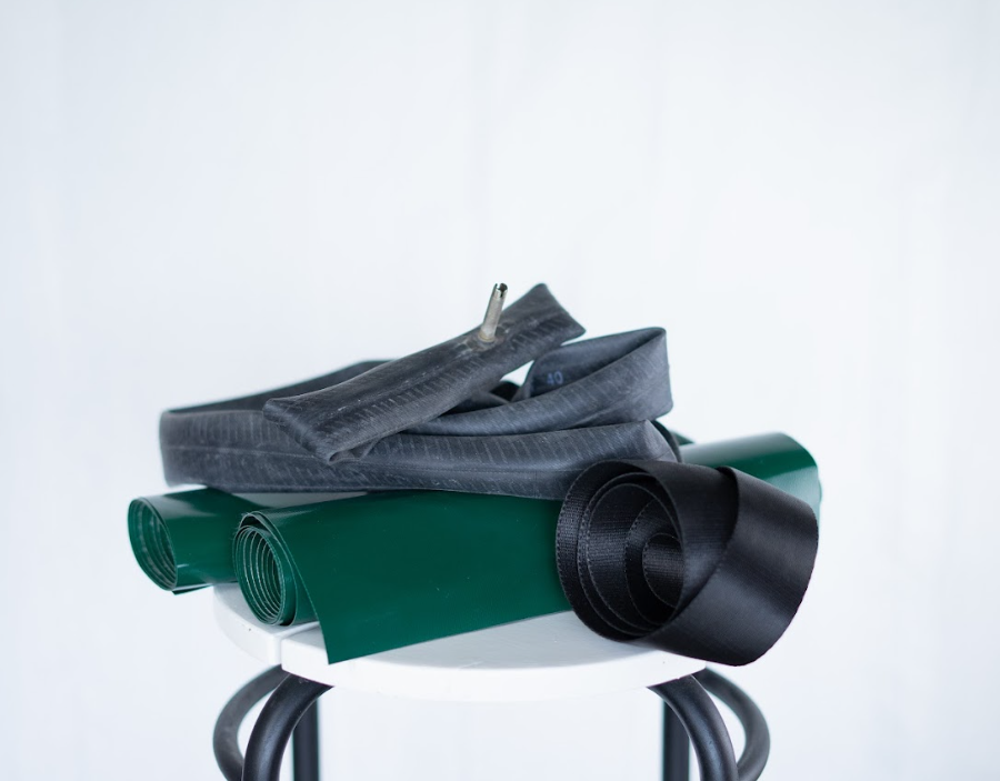 The first material that matched our ideas was the bike tube. Bike tubes are strong and leather-like, this makes them super suitable for the underside of a bag.